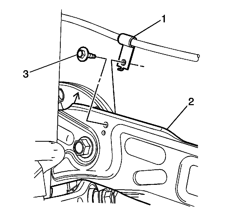 13. Install the park brake cable retaining bolt (3), park brake cable (1), on the trailing arm assemblies (2).