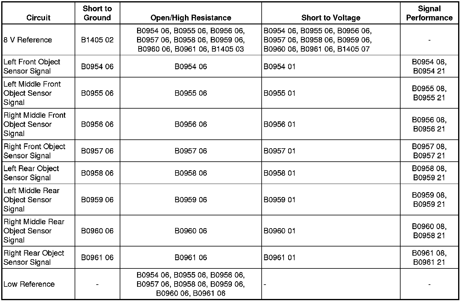 The object sensors are 3-wire sensors that are used to determine the distance between the vehicle and an object of interest. The parking assist control module supplies 8 V to the object sensors via the 8 V reference circuit and provides ground via the low reference circuit. The parking assist control module triggers the sensors in a sequential loop. After each sensor transmits, the parking assist control module uses the sensor echo received through the signal circuit to calculate the distance and position of an object.