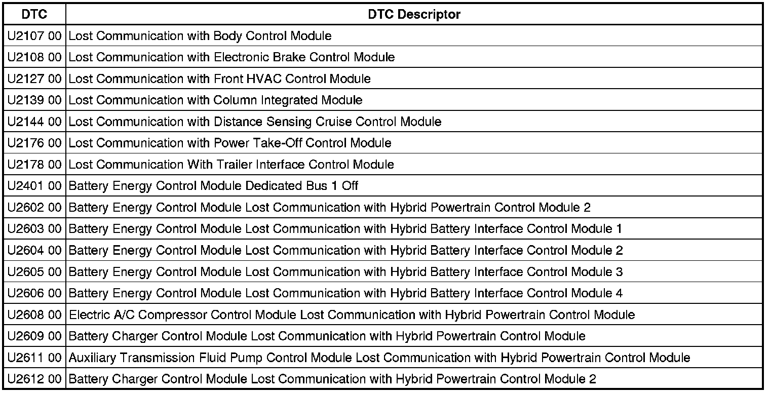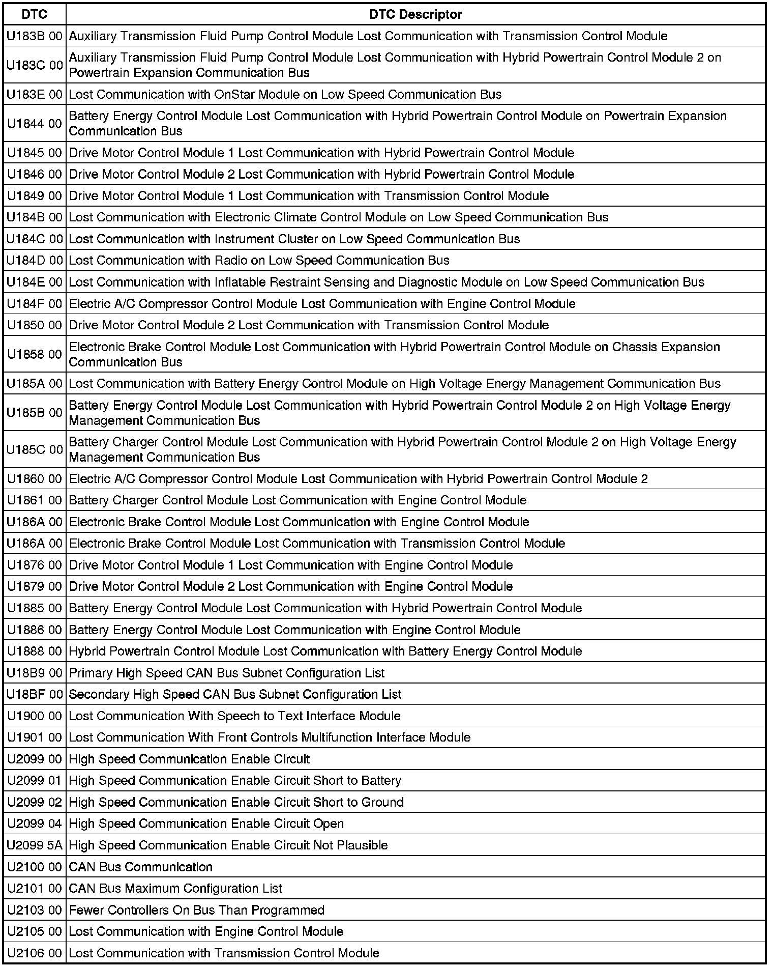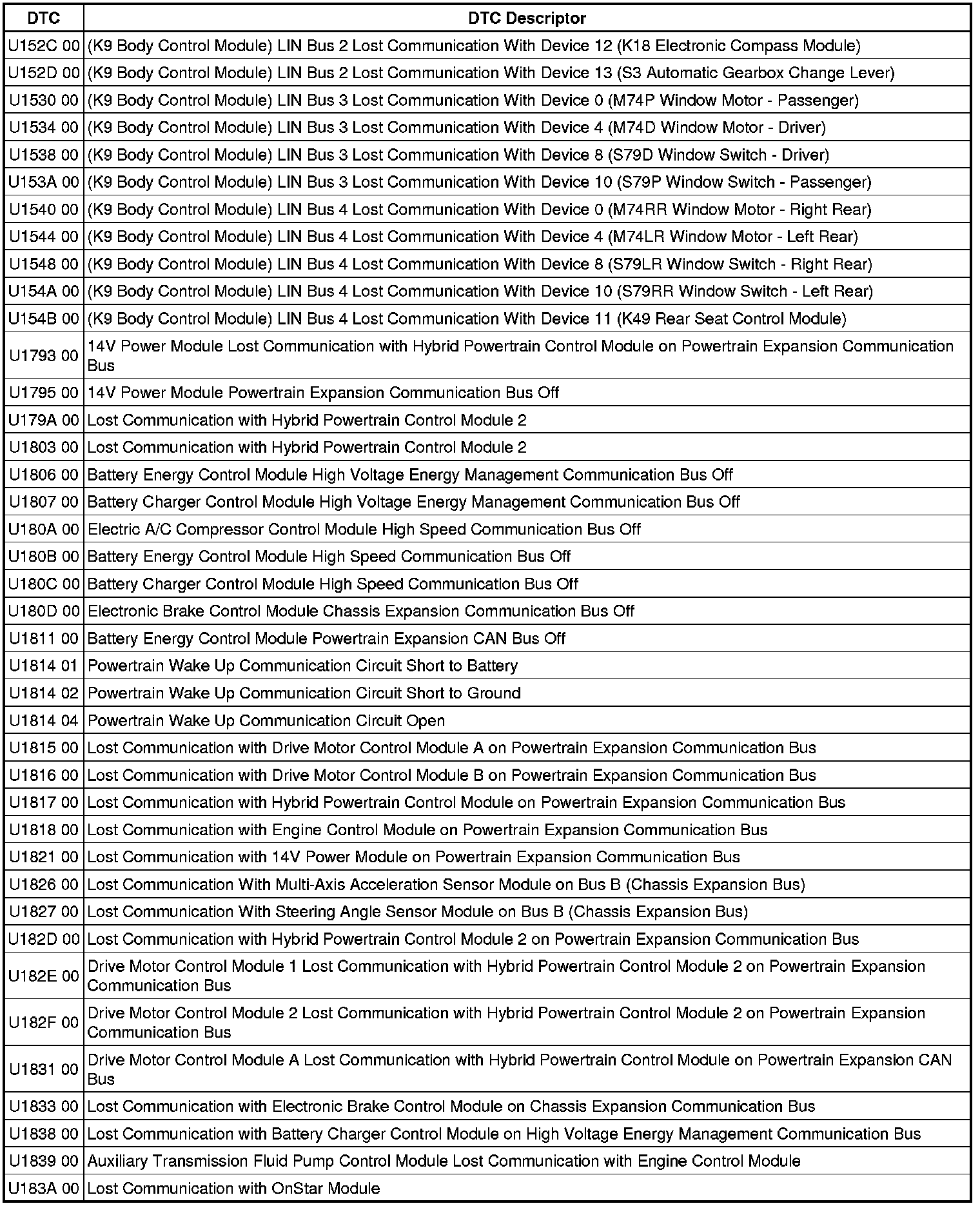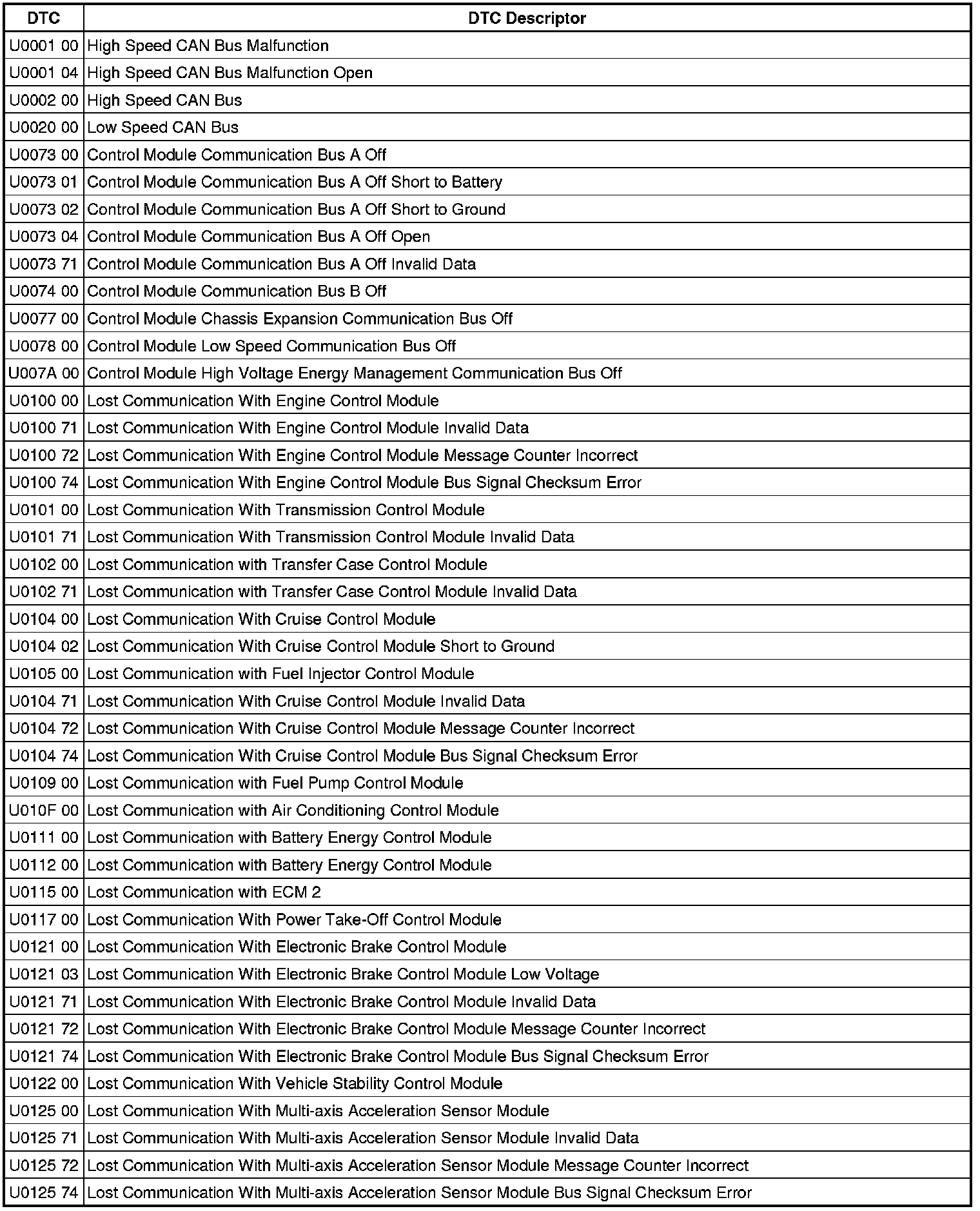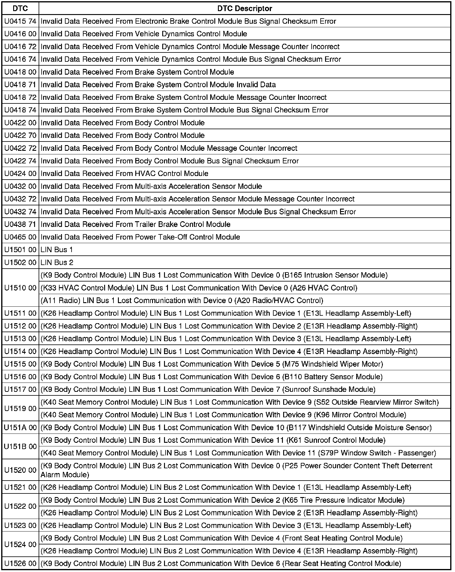 This list includes all Data Communications related U-code DTCs in alphanumeric order with descriptors for all modules. Not all DTCs listed will be applicable to all vehicles.