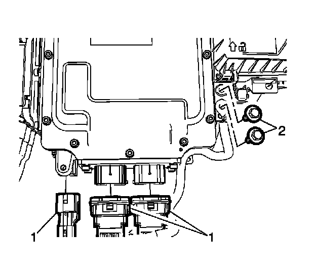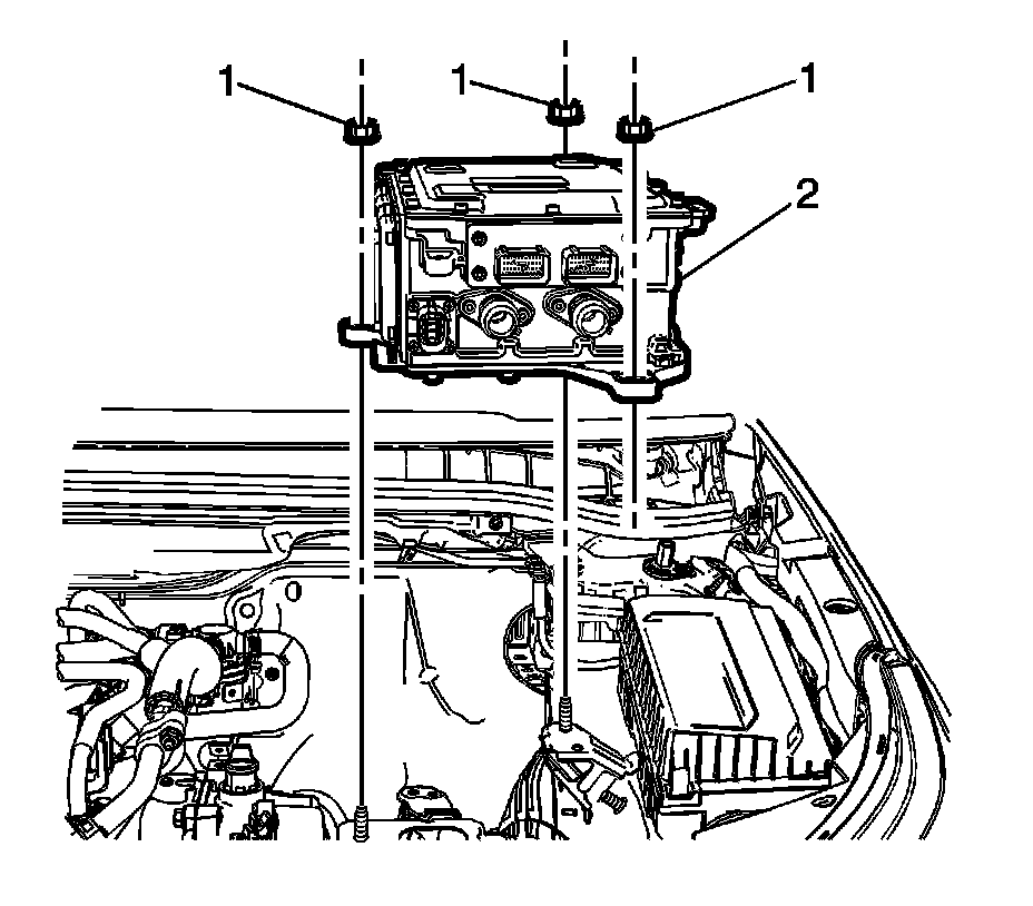 1. Install the drive motor power inverter control module (2) and tighten the fasteners (1) to 9 Nm(80 lb in).