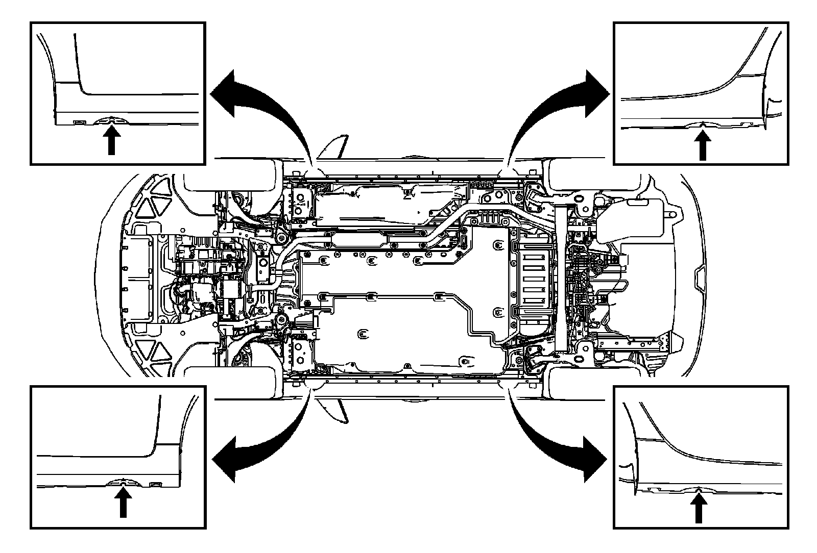 * Perform the vehicle lifting or jacking procedure only at the identified lift points. DO NOT allow the lifting equipment or jacking equipment to contact any other vehicle components.