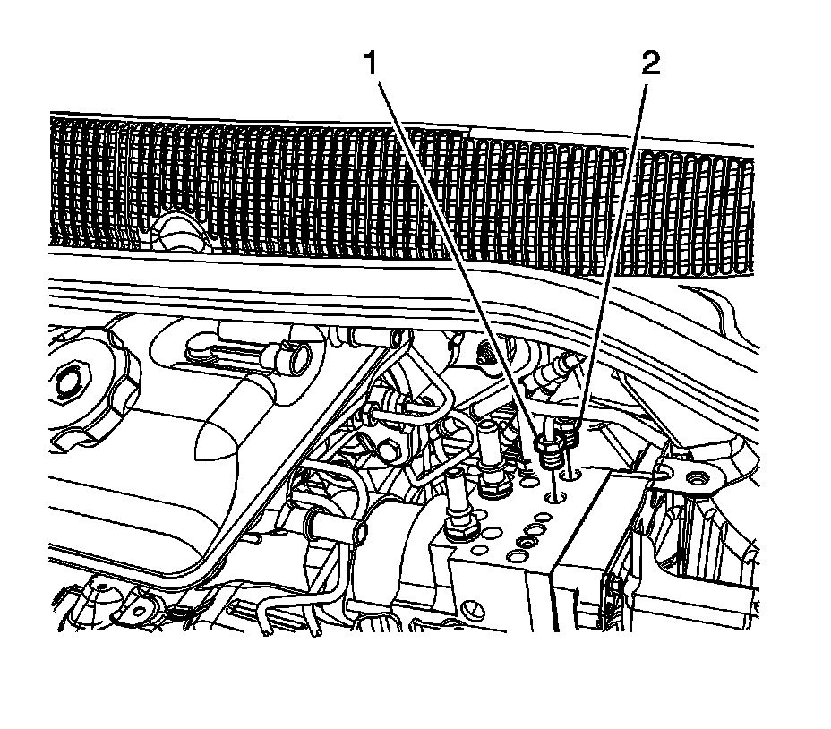 9. Install the left front (1) and right front (2) secondary brake pipes and tighten the fittings to 19 Nm (14 lb ft).