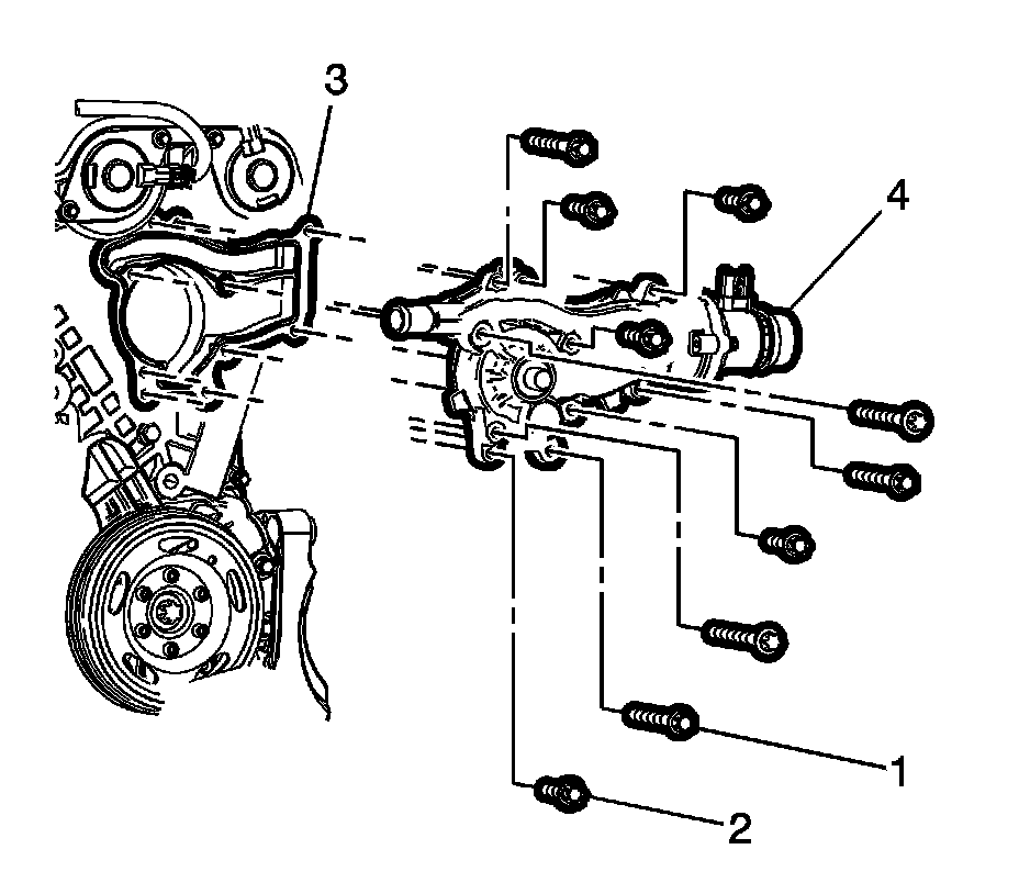 Install the 5 short water pump bolts (2) and the 5 long water pump bolts (1) and tighten in a cross sequence to