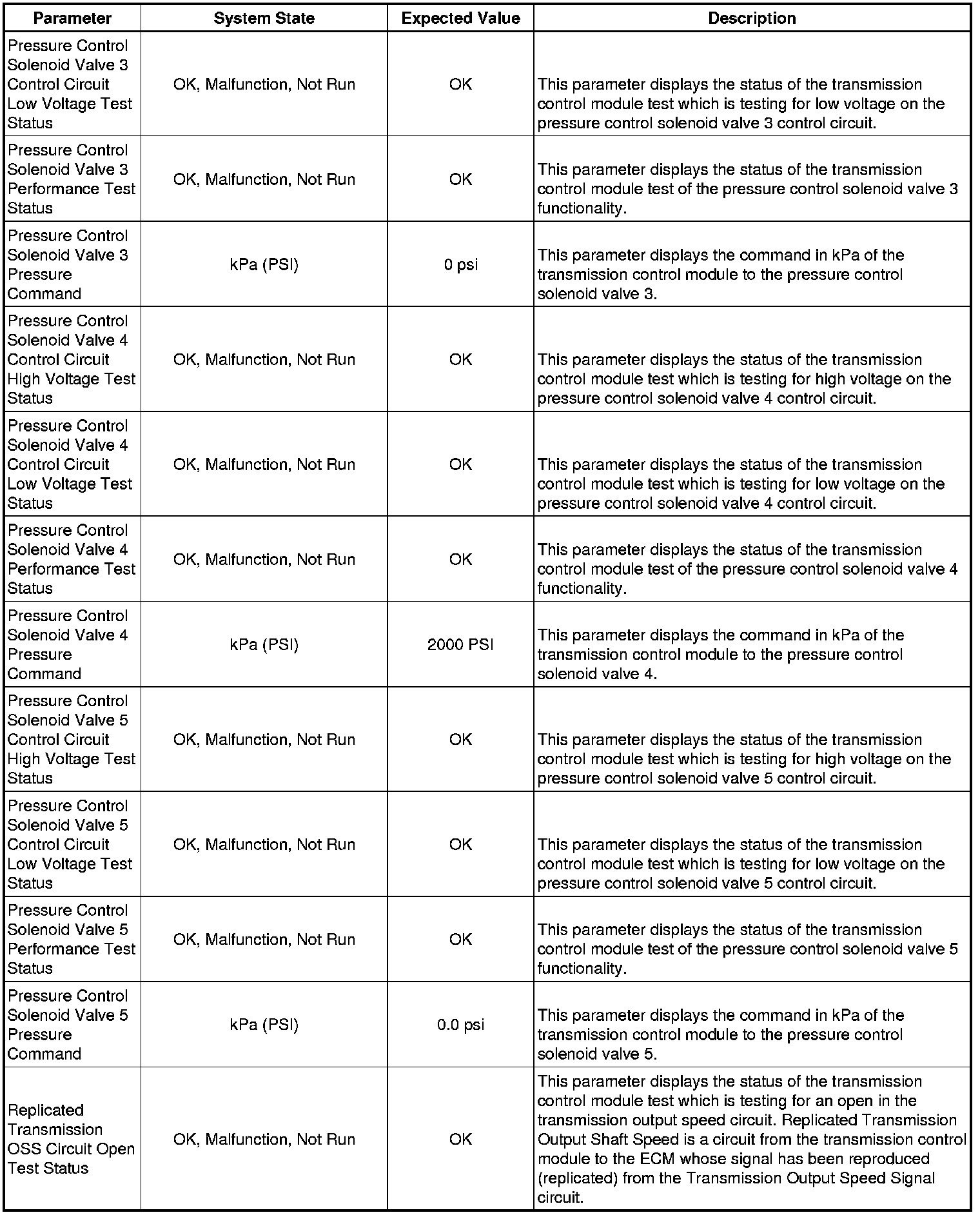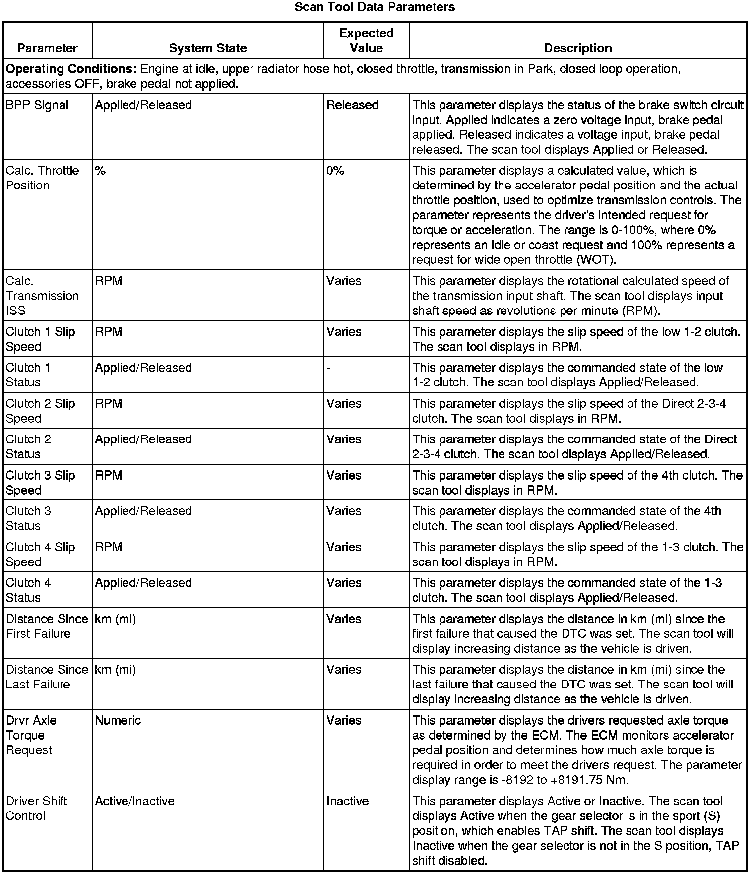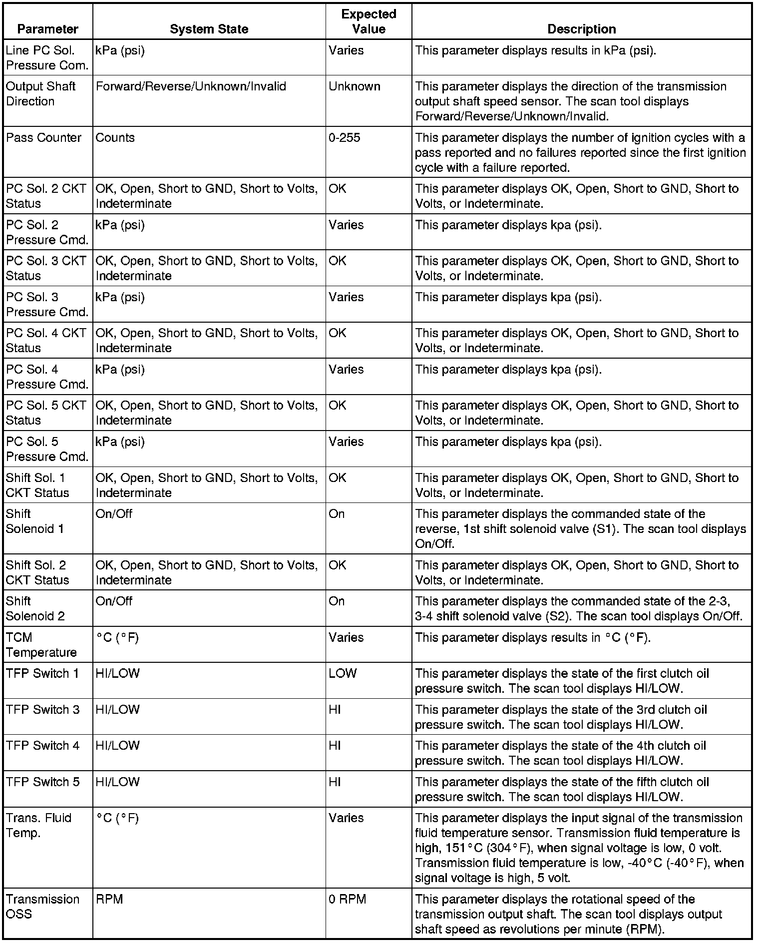 The Transmission Control Module Scan Tool Data List contains all transmission related parameters that are available on the scan tool. The list is arranged in alphabetical order. A given parameter may appear in any one of the data lists, and in some cases may appear more than once, or in more than one data list in order to group certain related parameters together.