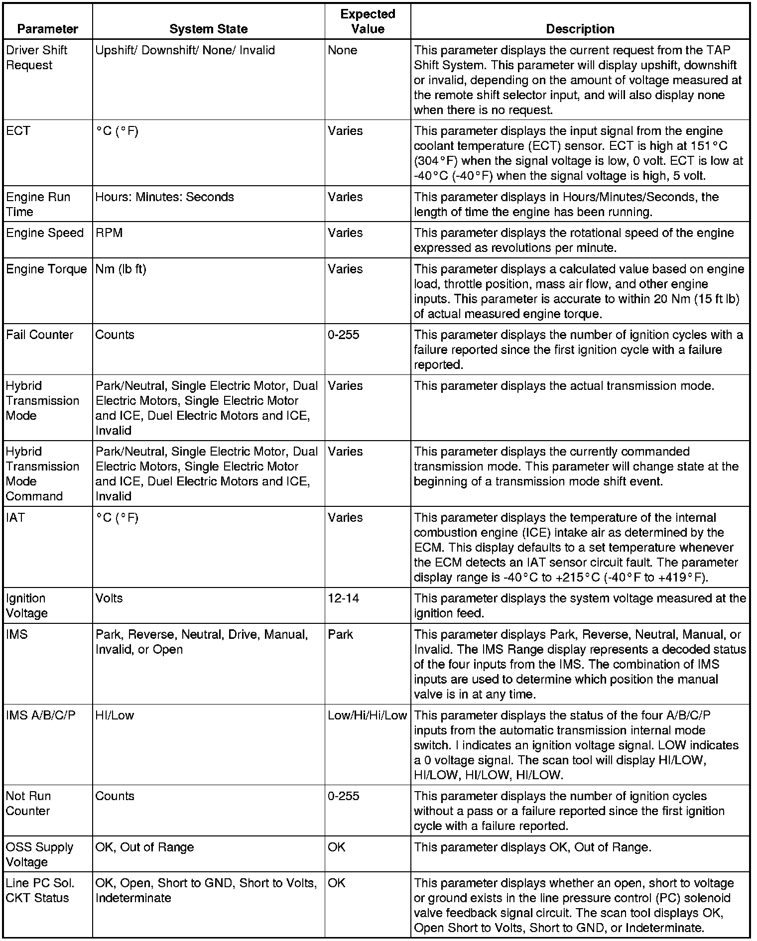 Only the parameters listed below are used/referenced in this manual for diagnosis. If a scan tool displays other parameters, those values are not recommended by General Motors for use in diagnosis.