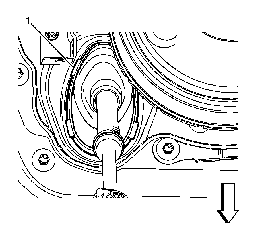 12. Working under the vehicle, ensure the 4 tabs (1) on the intermediate shaft seal engage the dash panel.