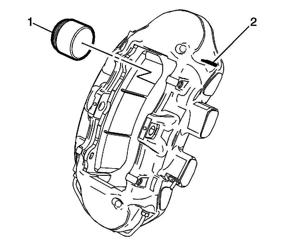 9. Carefully remove the brake caliper piston (1) by directing low pressure compressed air into the brake bleeder valve hole (2).