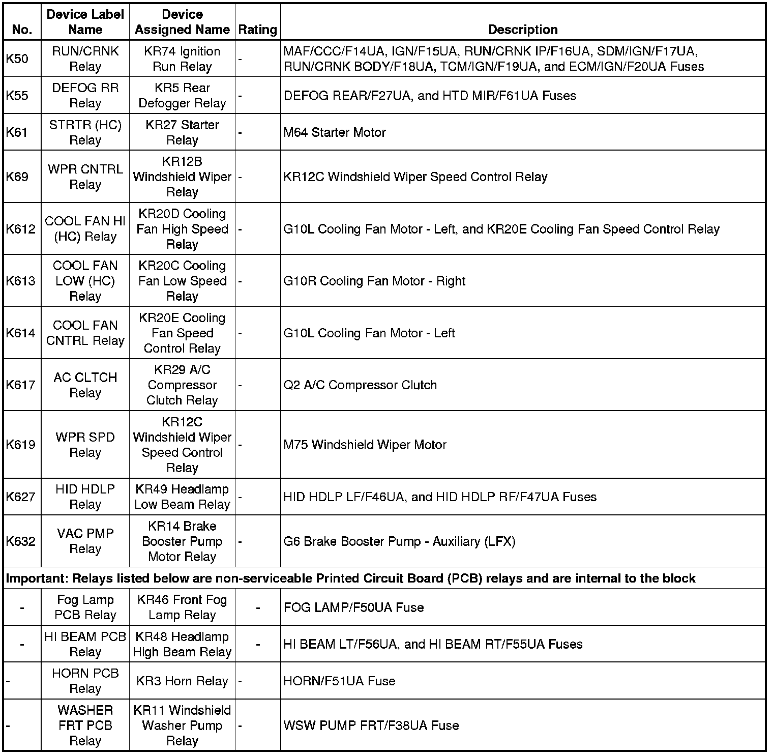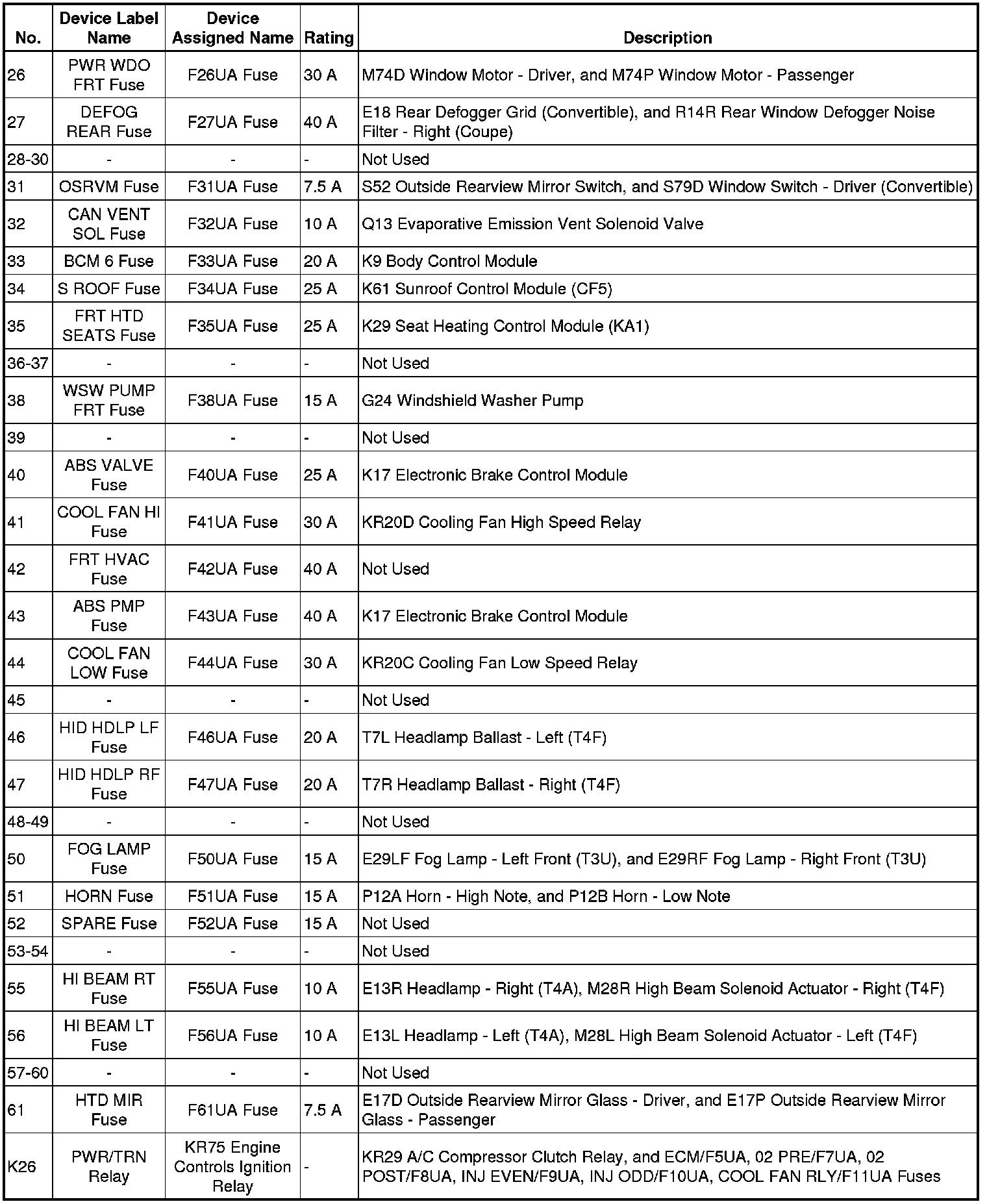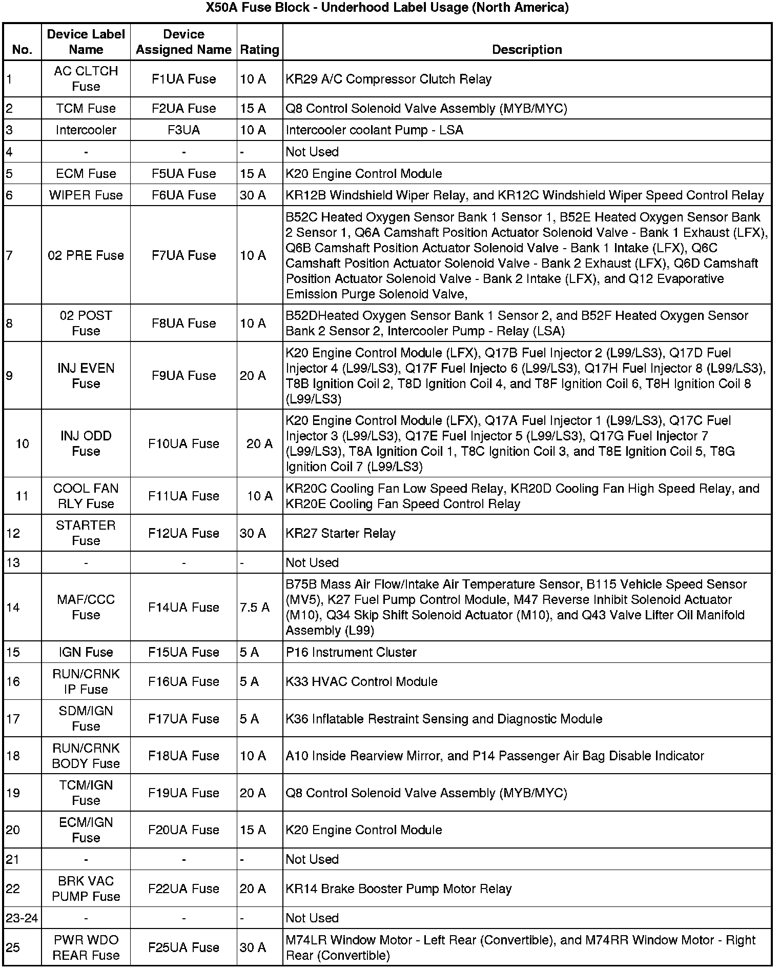 X50A Fuse Block - Underhood Label (North America)