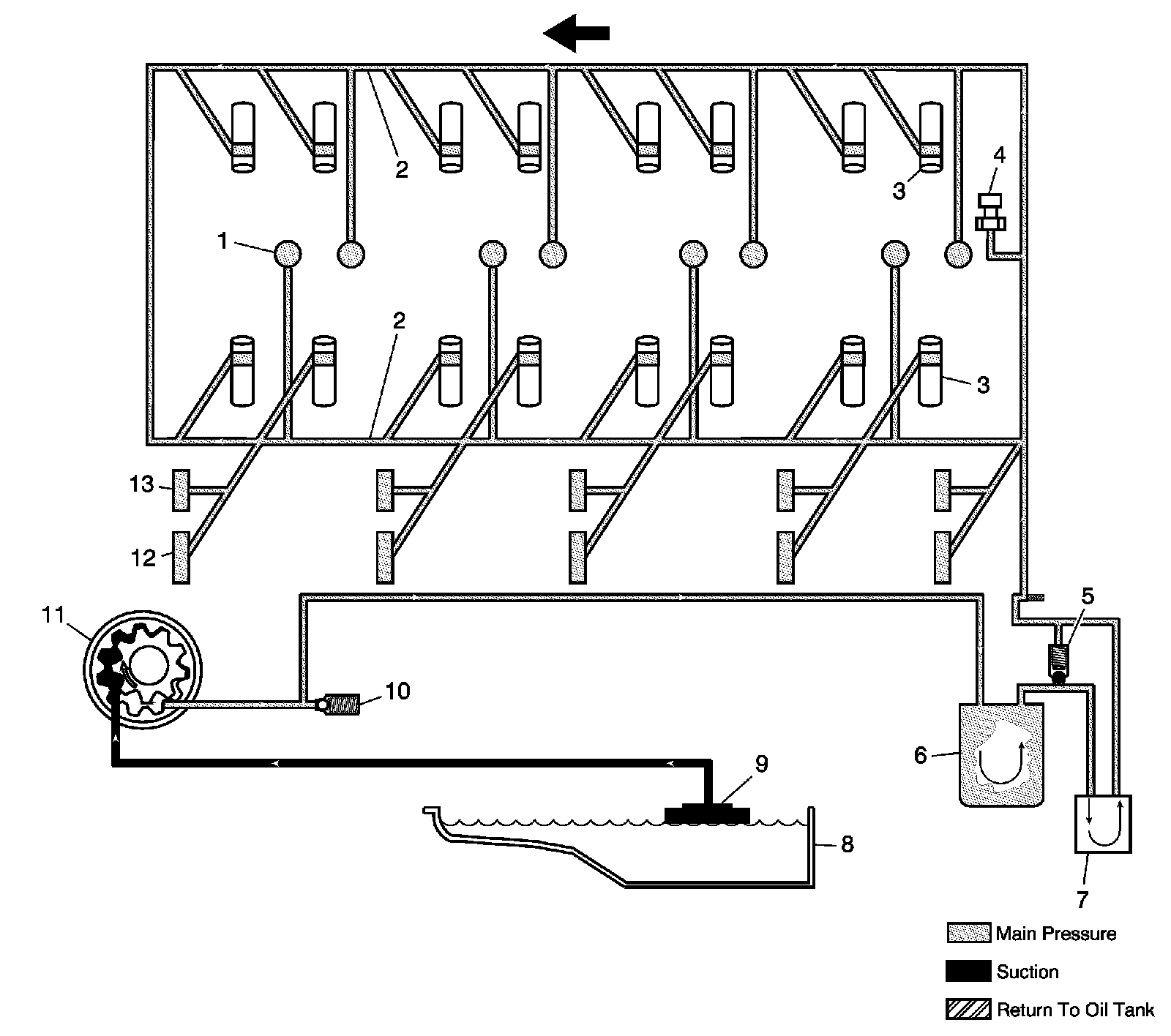 Engine lubrication is supplied by a gerotor type oil pump assembly (11). The oil pump assembly consists of a pump housing, gear set, and pressure relief valve (10). Refer to Disassembled Views (6.2L LSA) Locations. The pump assembly is mounted at the front of the engine and driven directly by the crankshaft sprocket. The pump gears rotate and draw oil from the oil pan sump (8) through the oil tank screen (9). The oil is pressurized as it passes through the primary pump and is sent through the engine block lower oil gallery. Contained within the primary pump is a pressure relief valve 10) that maintains oil pressure within a specified range. Pressurized oil is directed through the engine block lower oil gallery to the full flow oil filter (6) where harmful contaminants are removed. A bypass valve is incorporated into the oil filter, which permits oil flow in the event the filter becomes restricted. Oil exits the oil filter and is then directed to the external oil cooler (7). A bypass valve (5) is incorporated into the oil cooler assembly in the event oil flow within the cooler is restricted. Oil returns from the oil cooler and is directed to the upper main oil galleries (2). Oil from the left upper oil gallery is directed to the crankshaft bearings (12), valve lifters 1, 3, 5, and 7, camshaft bearings (13), and piston oil nozzles 1, 3, 5, and 7. Oil from the right upper oil gallery is directed to the valve lifters 2, 4, 6, and 8 and piston oil nozzles 2, 4, 6, and 8. The piston oil nozzle assemblies are designed to provide oil to the bottom side of the piston for cooling purposes. The piston oil nozzles have an internal check ball that is held in the normally closed position by the spring until system oil pressure exceeds 20.7 kPa (43.5 psi). Refer to Piston Oil Nozzle Cleaning and Inspection 62. Piston Oil Nozzle Cleaning and Inspection. Oil exits the valve lifters (3) and is then pumped through the pushrods to lubricate the valve rocker arms and valve stems. Oil then returns to the oil pan (8).The engine oil pressure sensor (4) is located at the top rear of the engine assembly.