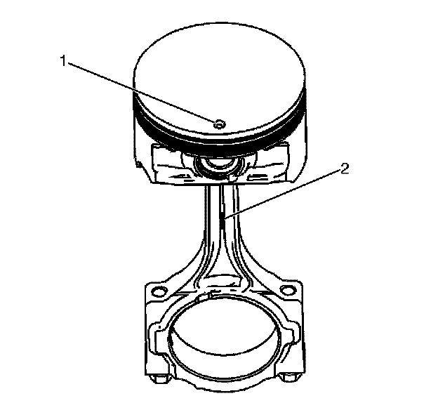 When installing the piston and connecting rod assembly, the mark on the top of the piston (1) and the painted mark (2) on the connecting rod should face the front of the engine.