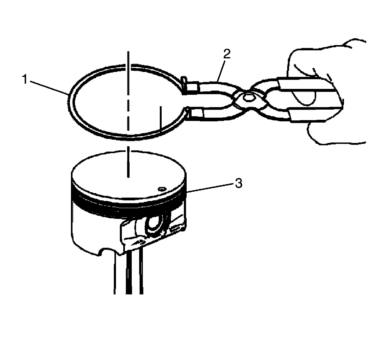 * Install the top piston ring (2) onto the piston (3) using the ring expander (1).