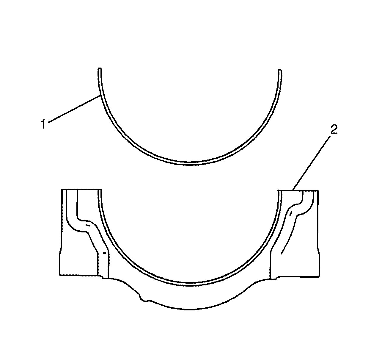 5. Install new lower connecting rod bearings (1) into position in the connecting rod cap (2). Roll the connecting rod bearings (1) into position so that the lock tang engages the alignment slot. The bearings must fit flush with the connecting rod cap (2).