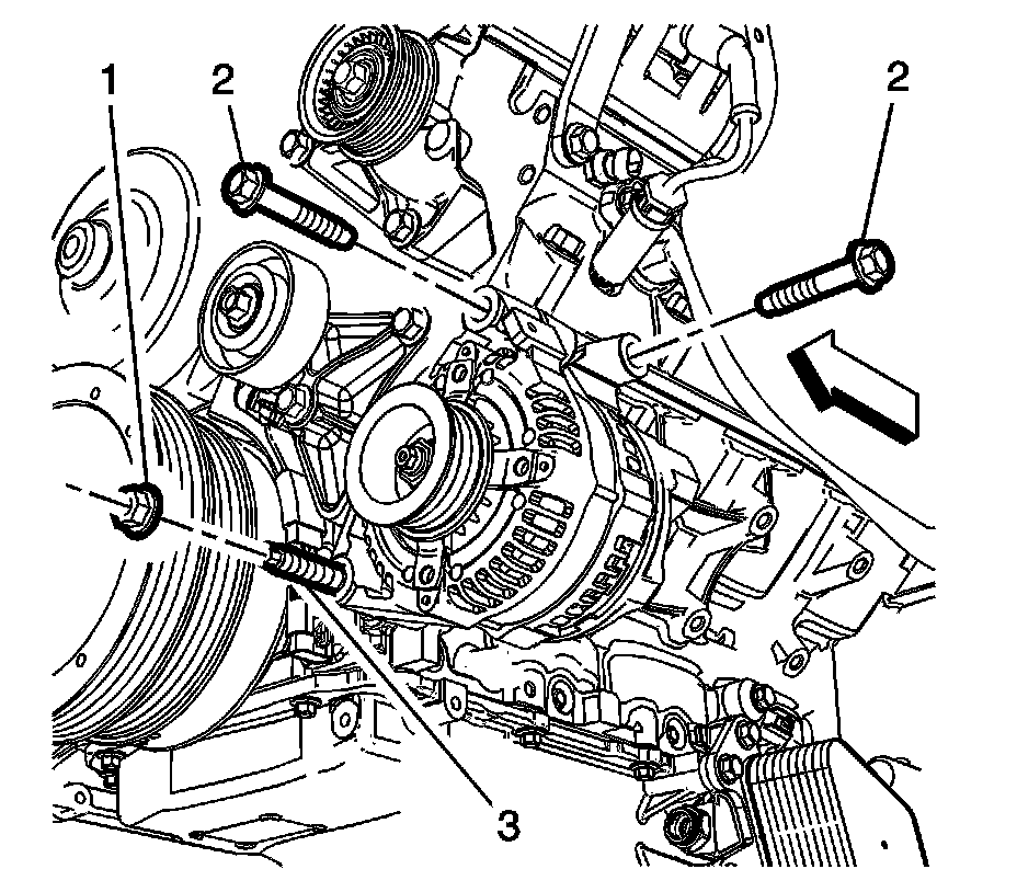 2. Remove the accessory drive belt. Refer to Drive Belt Replacement - Accessory (Except LSA) Drive Belt Replacement - AccessoryDrive Belt Replacement - Accessory (LSA) Drive Belt Replacement - Accessory.