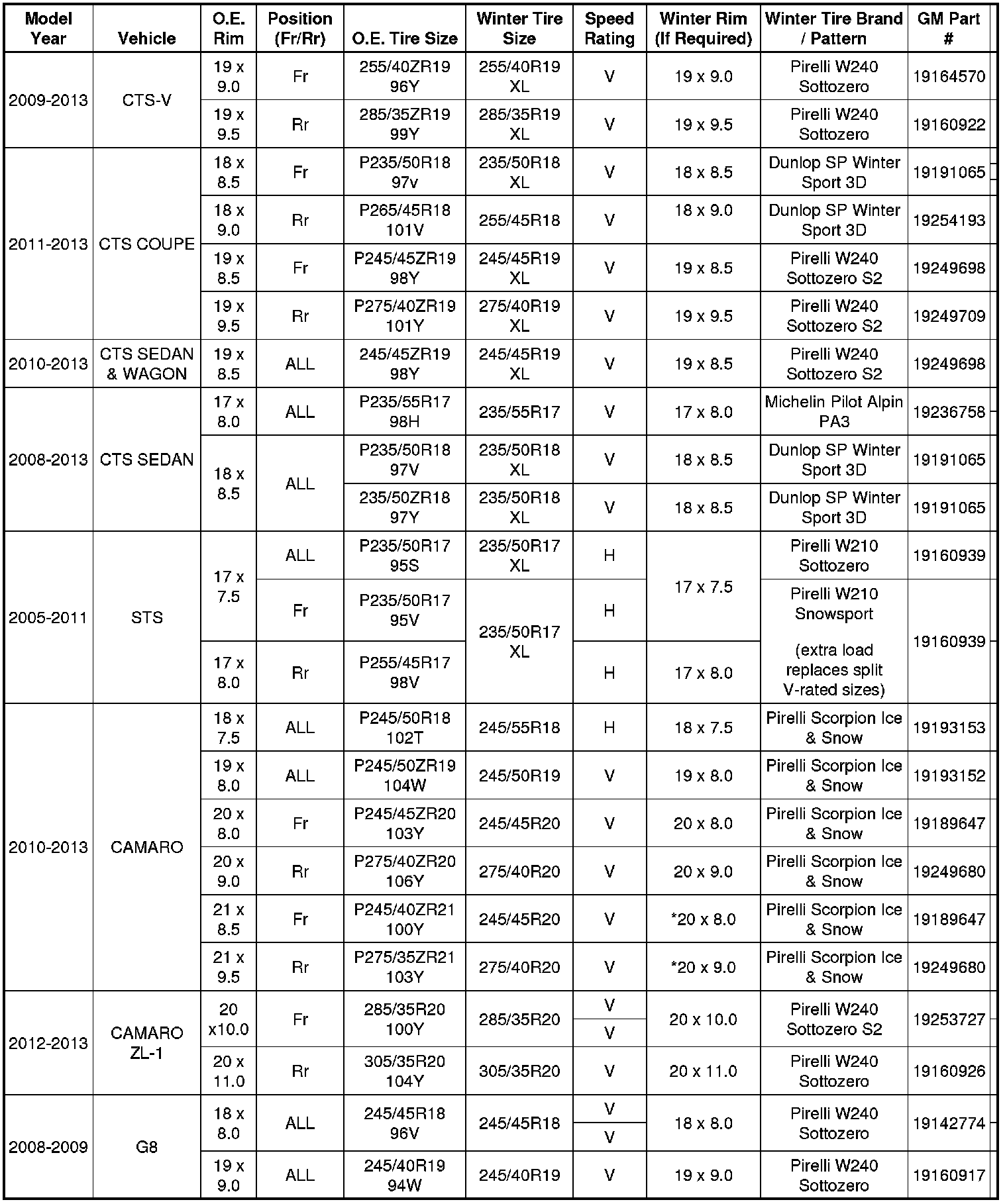 The tires listed in the chart below are some of the choices in winter tires currently available in sizes that match the OE tire. Due to seasonal model changes and constantly changing availability, all of the tires listed below are not guaranteed to be in stock. We believe these sources and their equipment to be reliable. There may be additional manufacturers of such products. General Motors does not endorse, indicate any preference for or assume any responsibility for the products or equipment from these firms or for any such items which may be available from other sources. A product's inclusion in the chart below does not imply any guaranteed level of performance. Purchase of any of the tires below is at the customer's cost and any and all warranties expressed are the sole responsibility of the tire manufacturer.