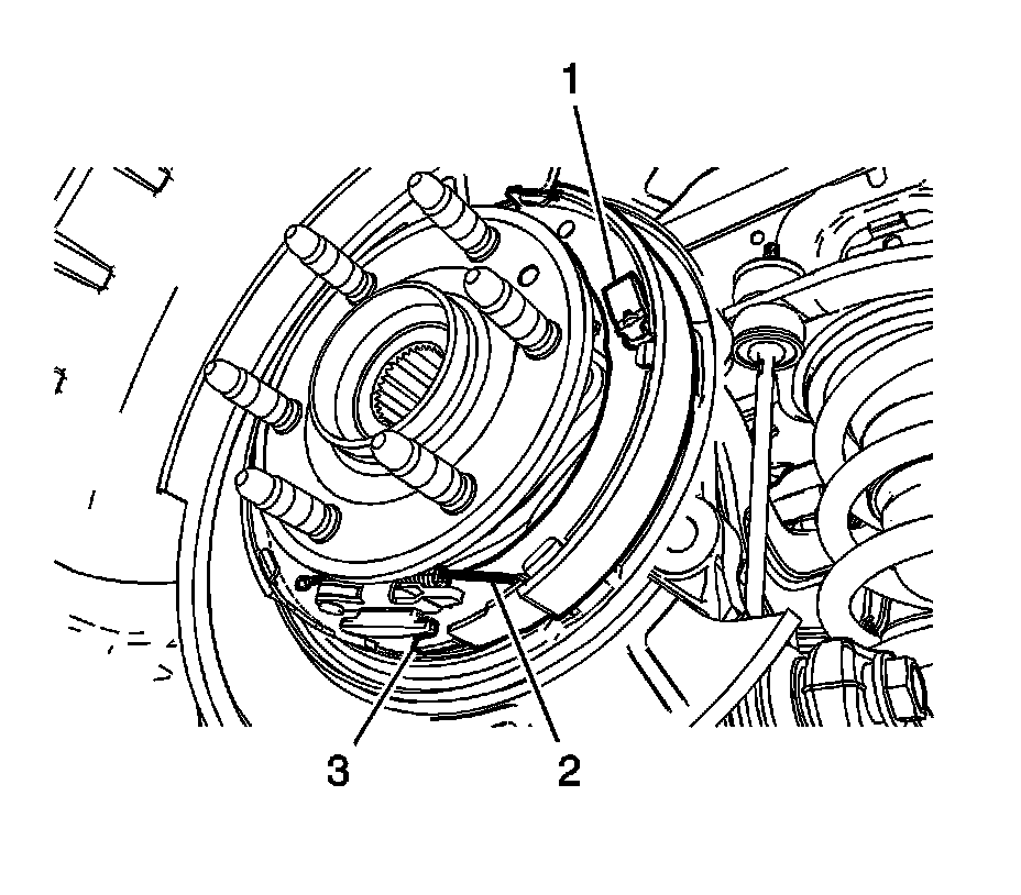 8. Remove the lower park brake shoe retainer spring (2) and the rear park brake shoe (3).