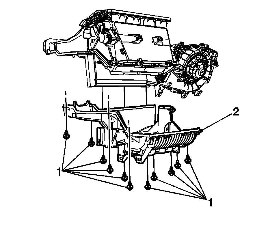 3. Install the heater core cover screws (1) and tighten to 1.5 Nm (13 lb in).