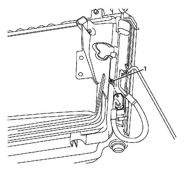Gently push the radiator and condenser towards the engine to allow installation of the condenser to radiator retaining bolts (1).