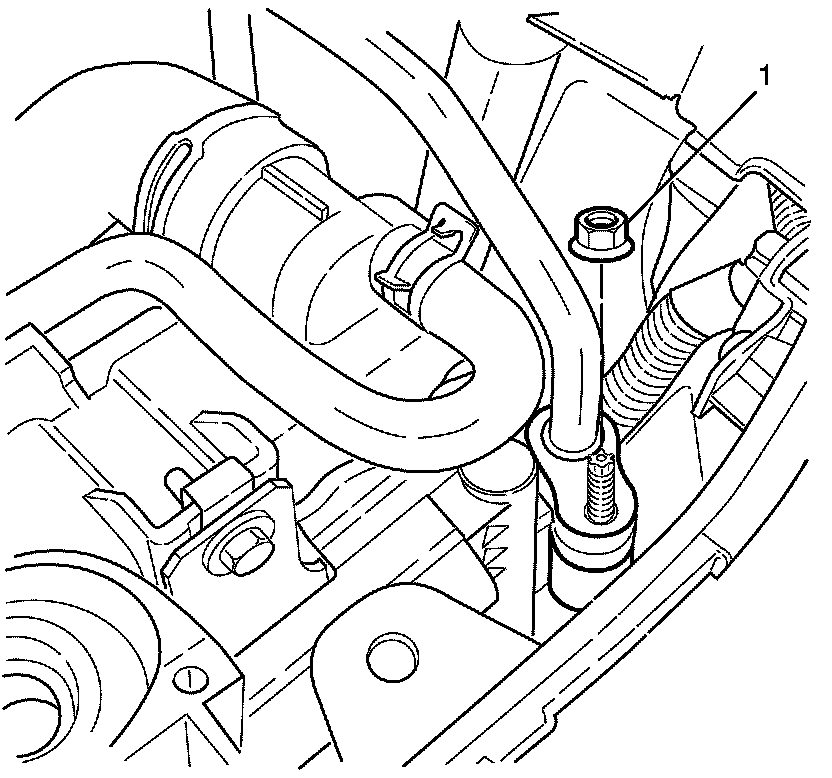 Gently push the radiator and condenser towards the engine to allow installation of the discharge pipe to condenser retaining nut (1).