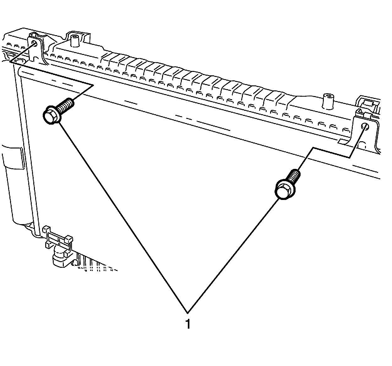 19. Remove the condenser to radiator retaining bolts (1).