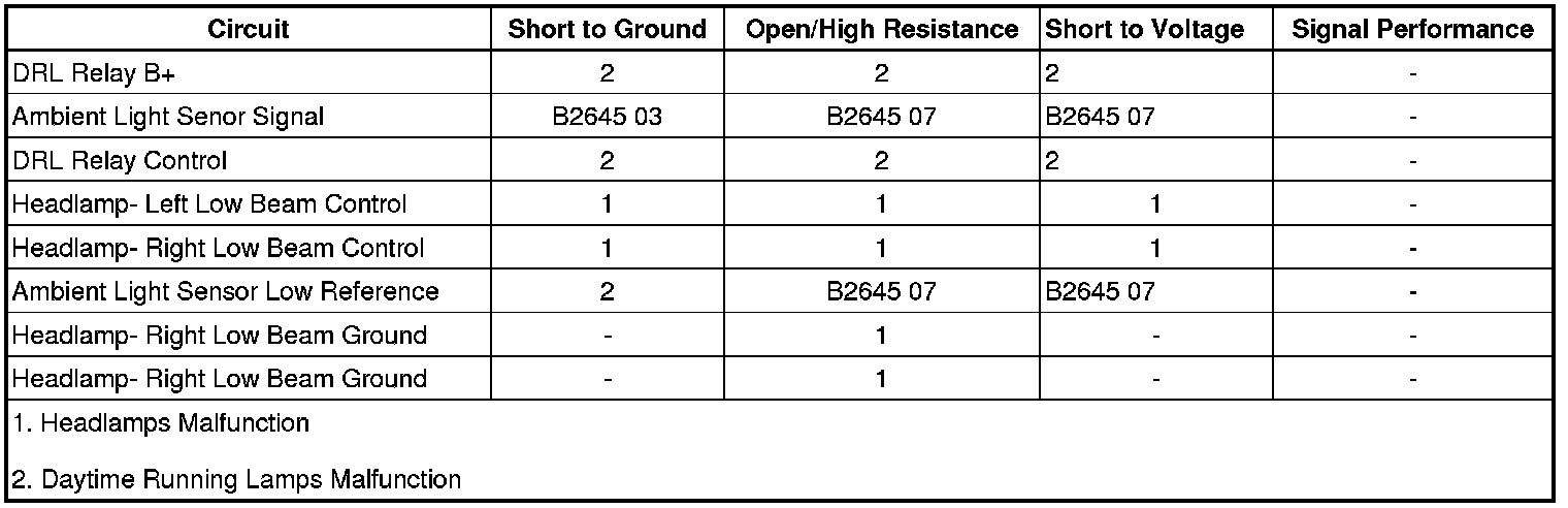 The ambient light sensor is used to monitor outside lighting conditions. The ambient light sensor provides a voltage signal that will vary between 0.2 and 4.9 volts depending on outside lighting conditions. The body control module (BCM) provides a 5-volt reference signal to the ambient light sensor and the HVAC control module provides a low reference ground. The BCM monitors the ambient light sensor signal circuit to determine if outside lighting conditions are correct for either daytime running lights (DRL) or automatic lamp control (ALC) when the headlamp switch is in the AUTO position. In daylight conditions the BCM will command the DRLs ON. During low light conditions the BCM will command the low beam headlamps ON. Any function or condition that turns on the headlamps will cancel DRL operation.
