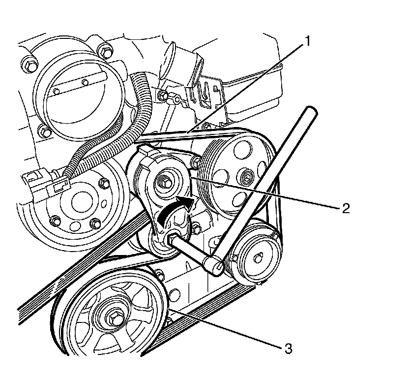 2. Using a suitable tool rotate the drive belt tensioner (2) clockwise.
