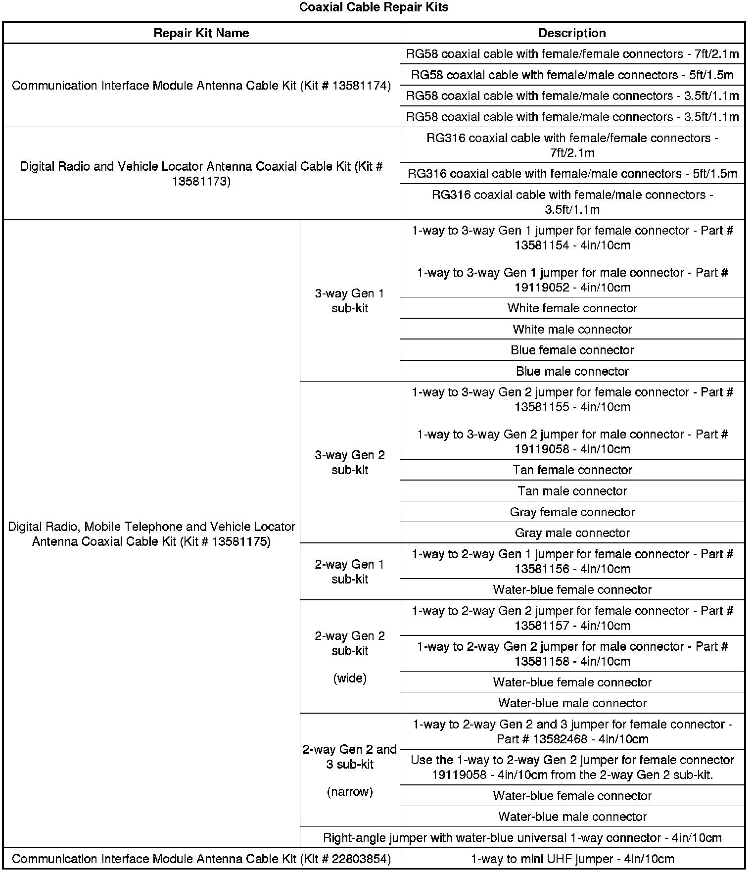 * Communication Interface Module Antenna Cable Kit (Kit # 13581174) is used to repair Cellular coaxial cables. This kit uses RG58 low loss coaxial cables that are available in four lengths. The coaxial cables can be attached together in various lengths to closely match the length of the faulty/damaged coaxial cable.