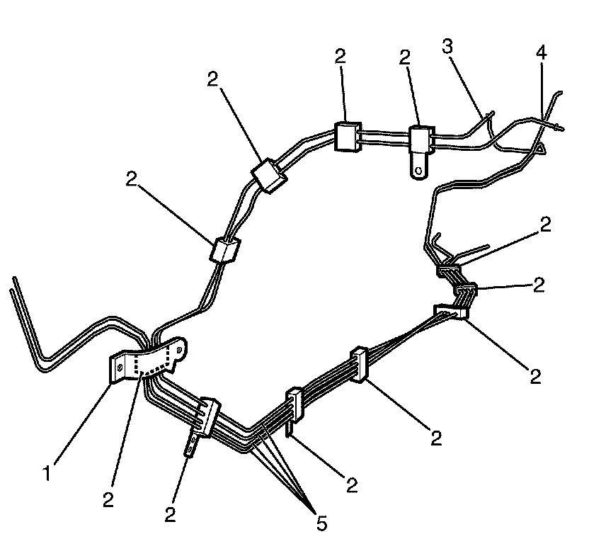 12. Remove all the fuel/brake pipe retainers (1) from the fuel/brake pipe assembly (2).