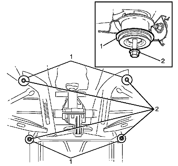 11. Tighten the NEW rear frame to chassis retaining bolts (1) and (2).