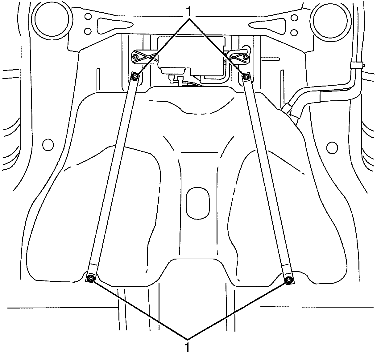 * Support the fuel tank assembly while installing the fuel tank assembly retaining straps to chassis retaining bolts (1).