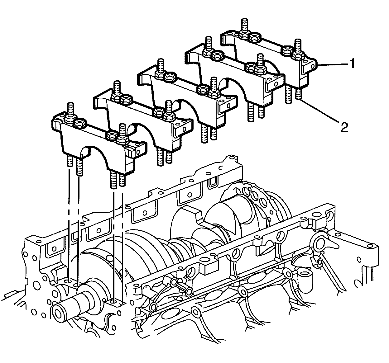 Install the crankshaft bearing cap bolts and studs (2).
