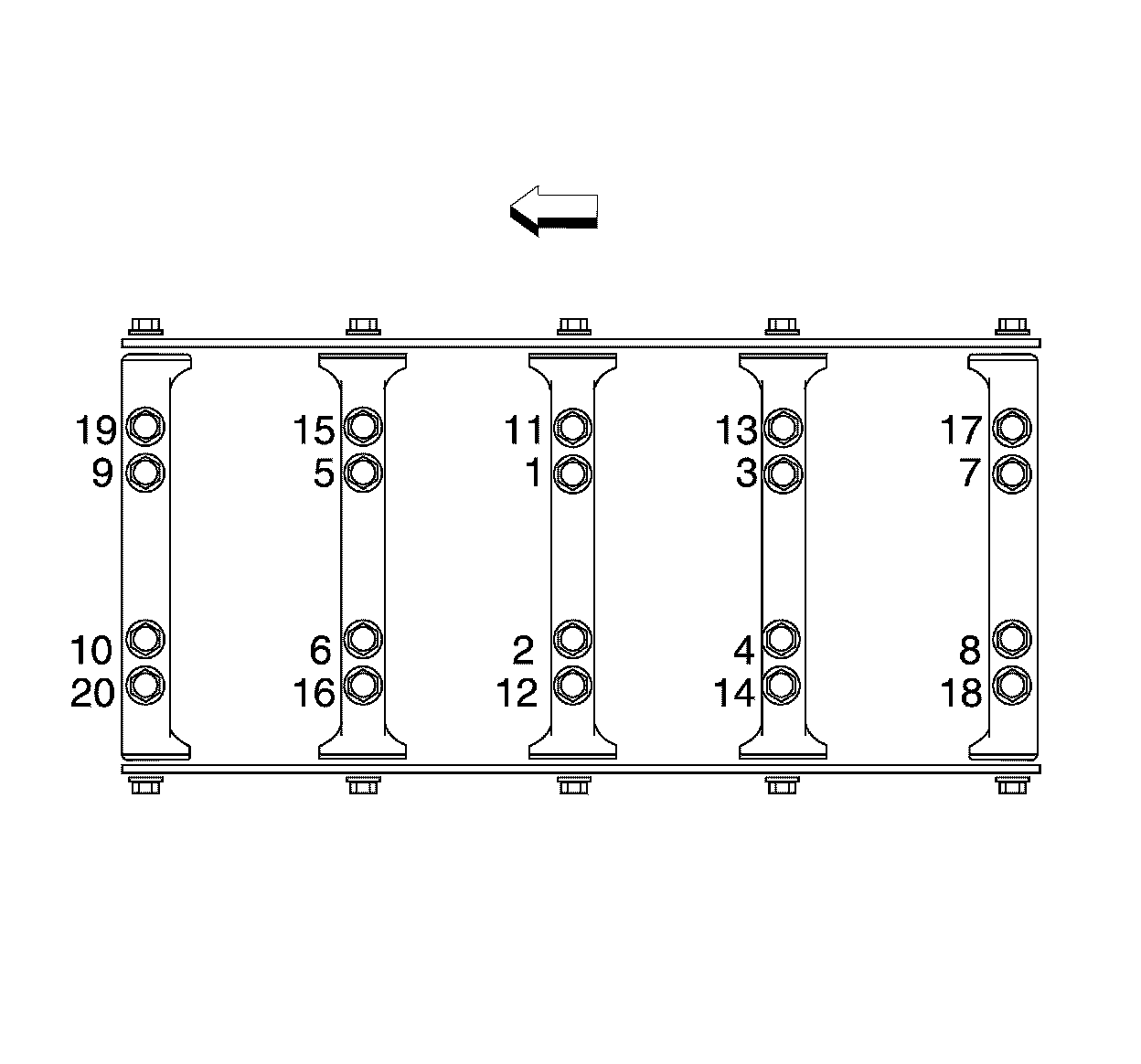 Tighten the crankshaft bearing cap to cylinder block inner retaining bolts (11 - 20) a first pass in sequence to 20 Nm (14 lb ft).