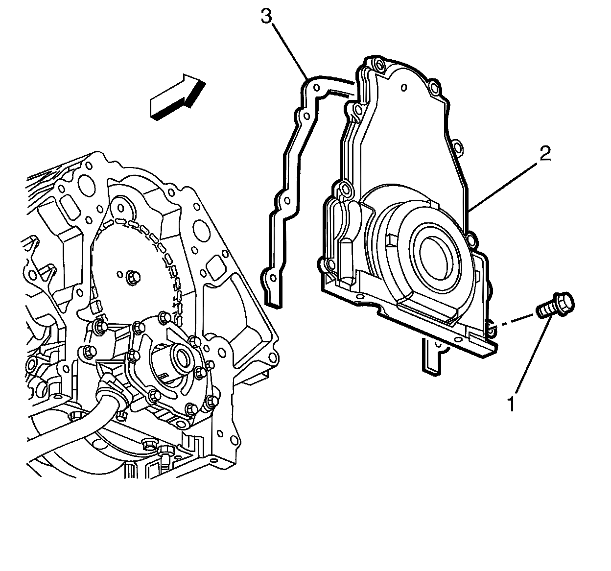 5. Remove the engine front cover (2) and gasket (3).