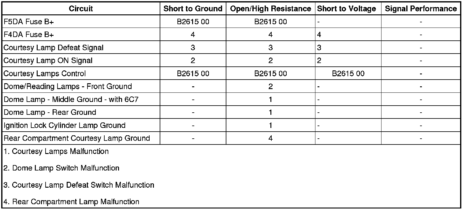 • If the courtesy lamps do not turn On and Off when commanded, refer to Courtesy Lamps Malfunction.