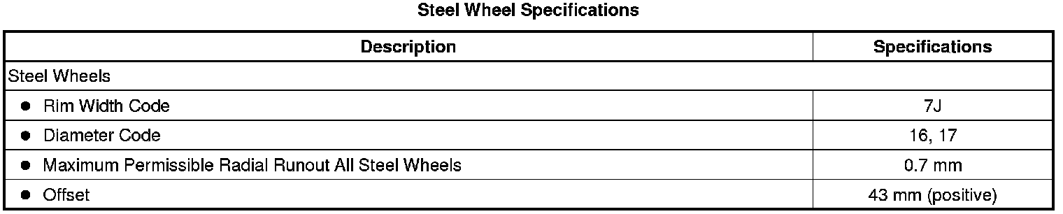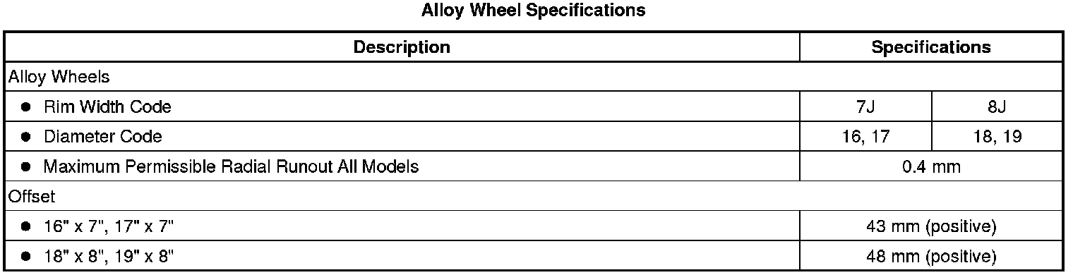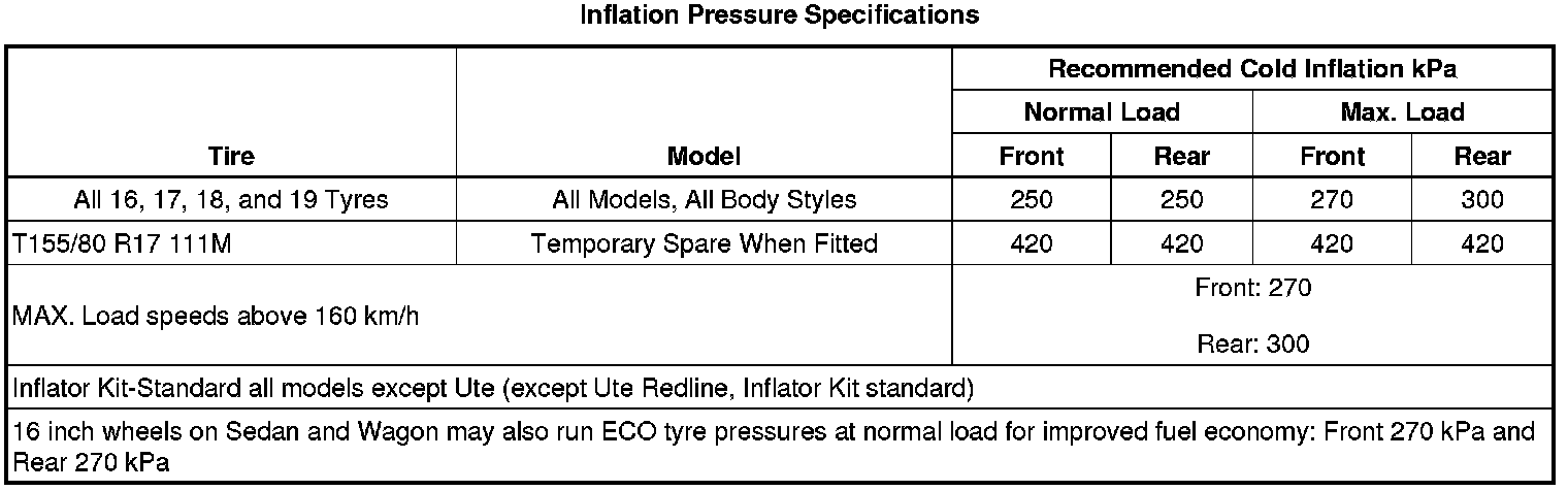 Tire and Wheel Specifications (Except HSV)