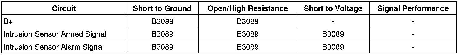 The intrusion sensor detects movement within the vehicle while parked. B+ is supplied to the intrusion sensor at all times and the body control module (BCM) arms the sensor using the intrusion sensor armed signal circuit. If movement is detected while armed, BCM is informed via the intrusion sensor alarm on signal circuit. The BCM will then sound the content theft alarm.