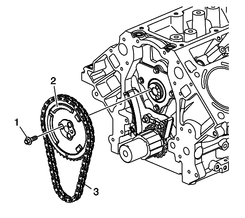 9. Install the camshaft sprocket (2), timing chain (3), and bolt (1).