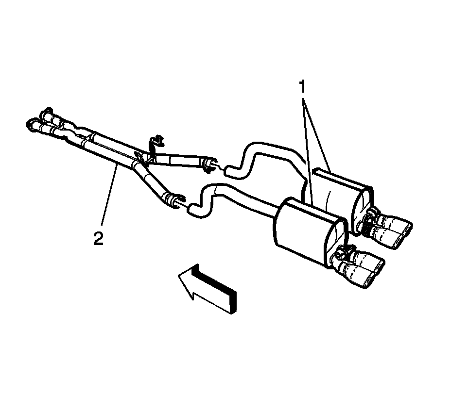 4. Separate the exhaust mufflers (1) from the intermediate pipe (2).