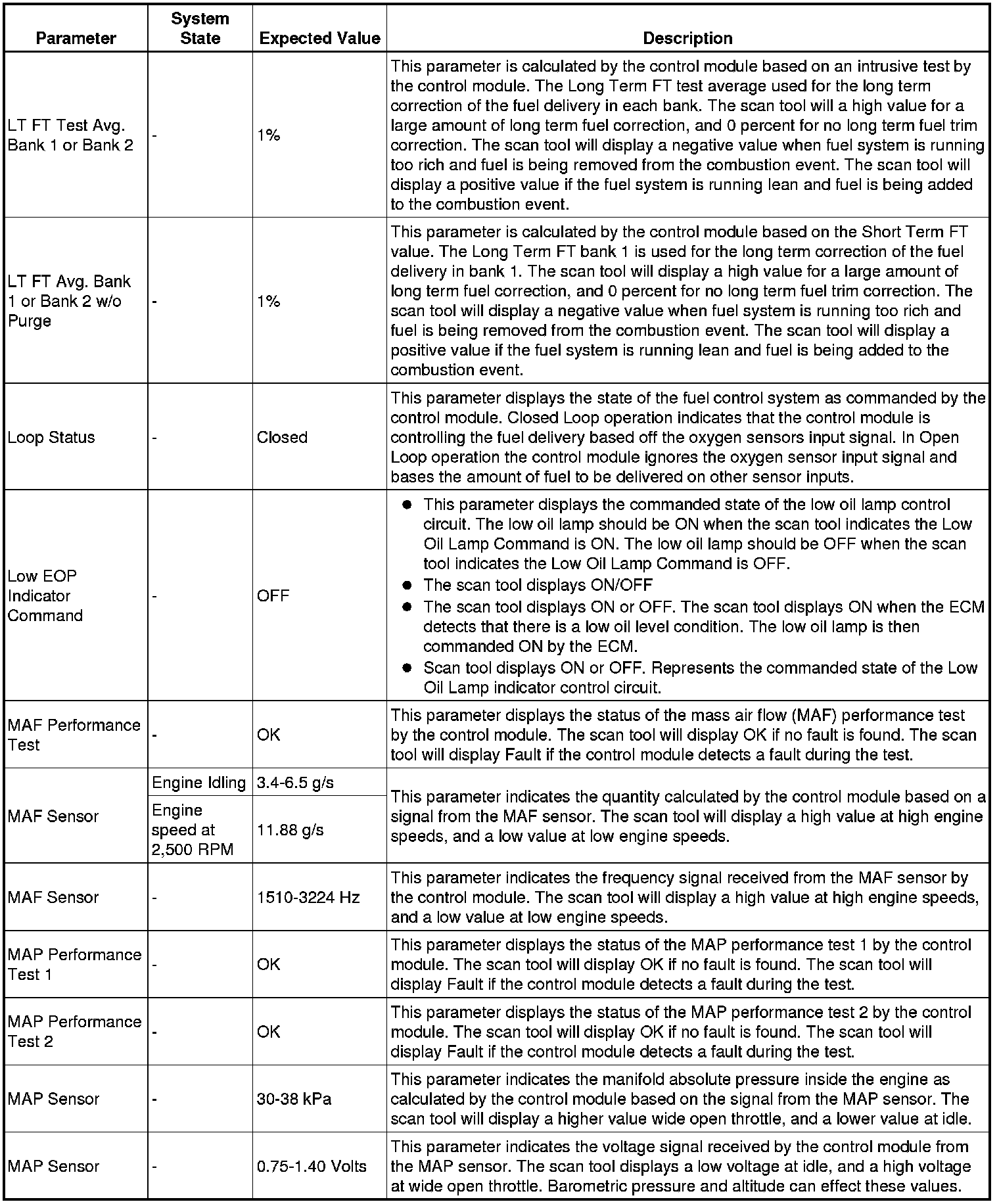 The scan tool values from a properly running engine may be used for comparison with the engine you are diagnosing. The engine scan tool data list represents values that would be seen on a normally running engine.