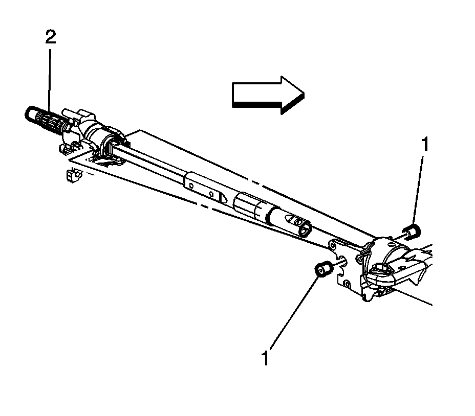 7. Using the J 21854 Pivot Pin Remover (2), and while supporting the steering column housing assembly, remove the steering column pivot pins (1).