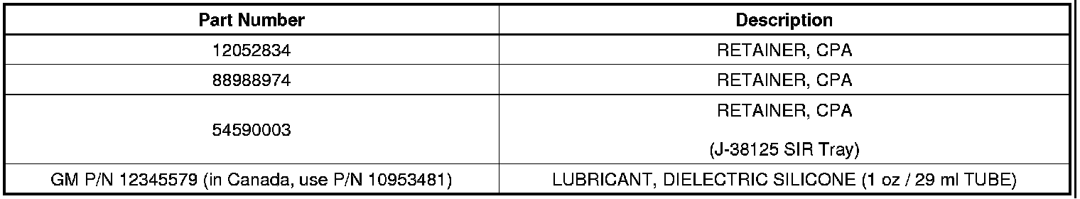 If the CPA retainer P/N 54590003 (Orange CPA) cannot be located in the J-38125 SIR Terminal Repair Kit, contact Kent Moore Tools @ 1-800-GM-TOOLS and order P/N 54590003-PKG to obtain a package of 5.
