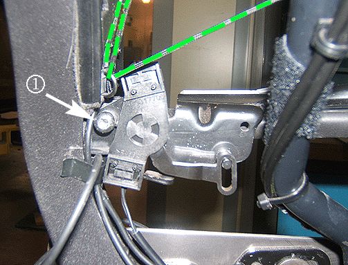 13. Remove the screw (1) holding the end eyelet of the short headliner string to the inboard side of the side rail links (shown in blue above), from the right and left side.