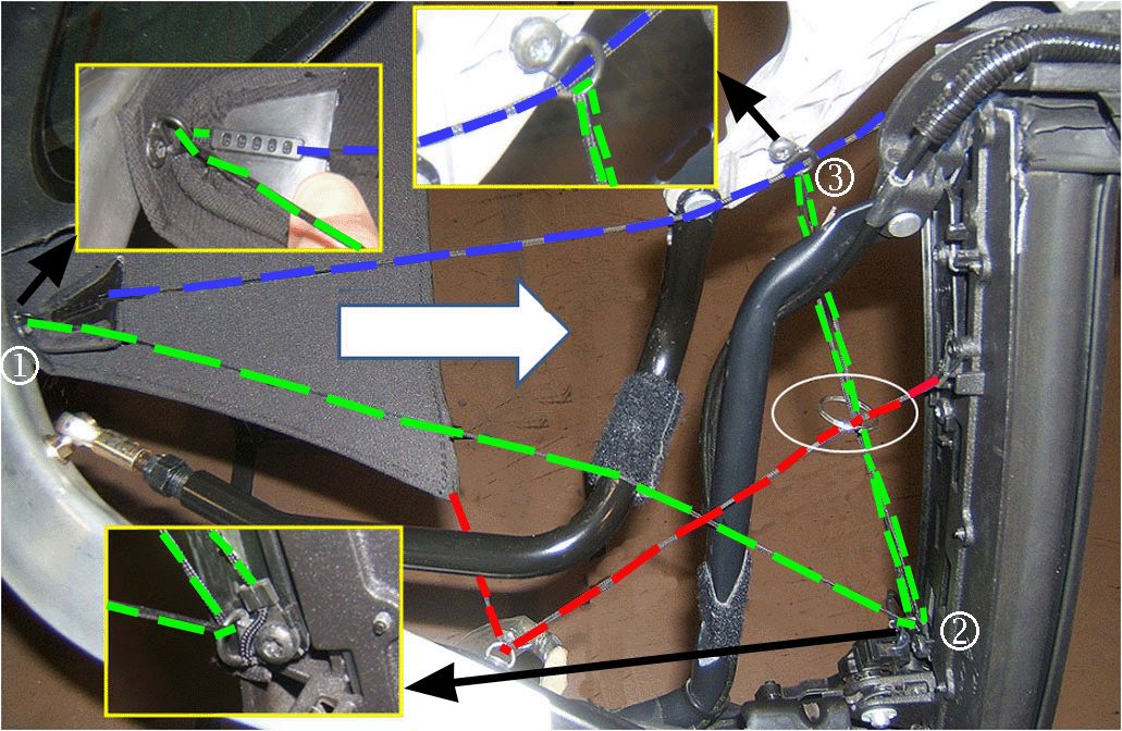 The short headliner string (shown in blue in the graphic below) must be routed through the third D-ring (3) of the longer string. This is easier to do PRIOR to attaching the third D-ring and can be accomplished by slightly opening up the diameter of the D-ring to allow the short string's end eyelet to pass through.
