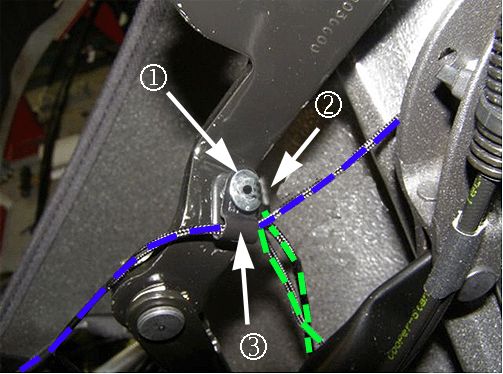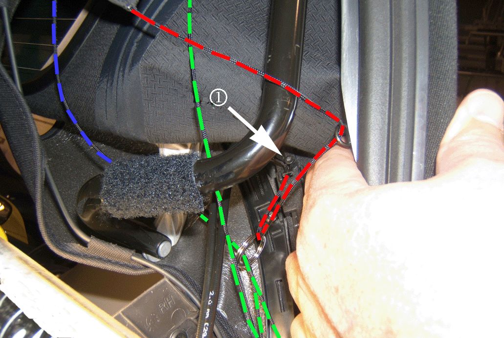 Prior to securing the rivet, ensure that the short headliner string (shown in blue above) is routed through the P-clip and that the D-ring and P-clip are in the proper orientation. The P-clip should point to the outside of the vehicle and the D-ring should point forward.