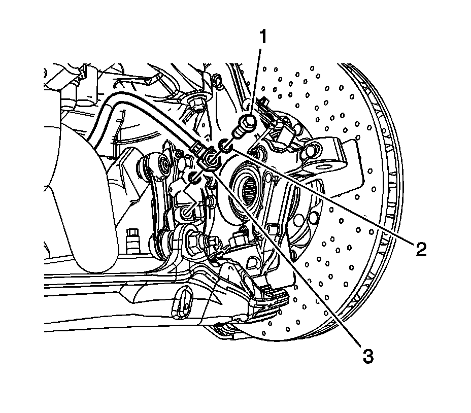 3. Assemble the brake hose fitting bolt (1) and 2 new brake hose fitting gaskets (2) to the brake hose (3).