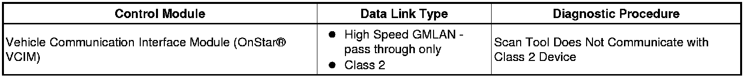 This table identifies which serial data link that a particular module uses for in-vehicle data transmission. Some modules may use more than one data link to communicate. Some modules may have multiple communication circuits passing through them without actively communicating on that data link. This table is used to assist in correcting a communication malfunction. The body control module (BCM) emulates some devices that are on high speed GMLAN serial data circuit to the modules on class 2 serial data circuit. The BCM transmits multiple Node Alive messages using source IDs that correspond to each of those high speed GMLAN nodes. This is in addition to the BCM behaving itself as a real node. For the description and operation of these serial data communication circuits refer to Data Link Communications Description and Operation Description and Operation.