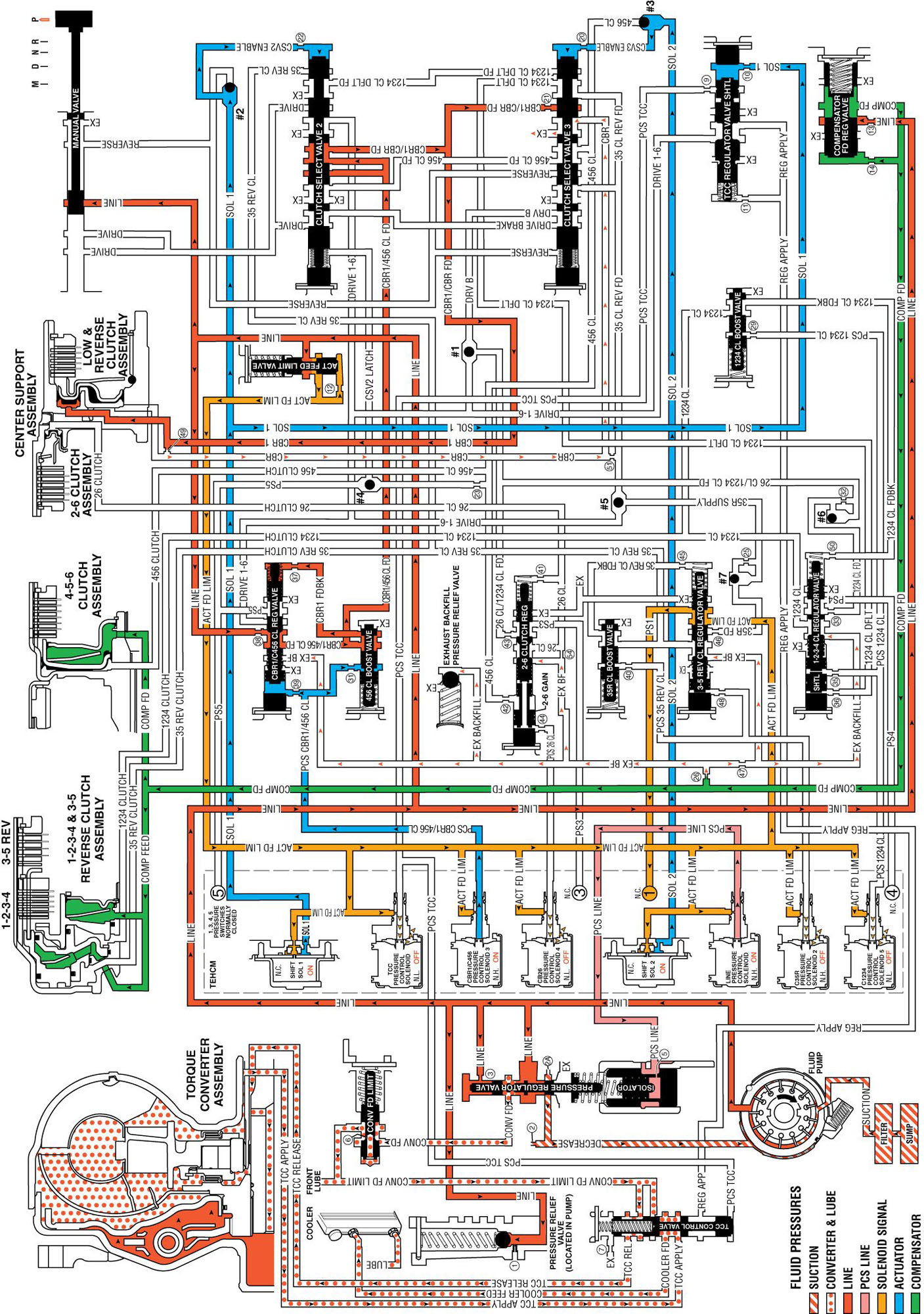 The CBR1/C456 pressure control solenoid (PCS) is energized (HIGH) allowing actuator feed limit fluid to enter the PCS CBR1/C456 CL fluid circuit. PCS CBR1/C456 CL fluid is then routed through orifice #31 to the 4-5-6 clutch boost valve and through orifice #39 to the CBR1/ C456 clutch regulator valve.