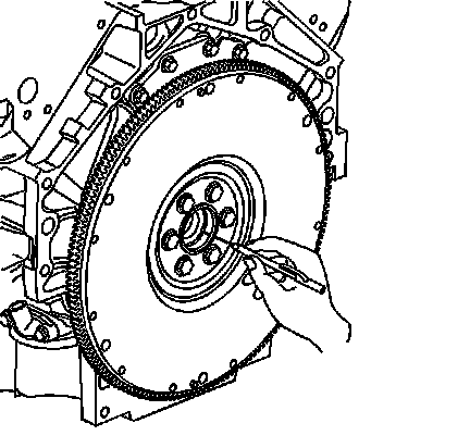 * For manual transmission applications, note the position and direction of the engine flywheel before removal. The flywheel does not use a locating pin for alignment. Mark or scribe the end of the crankshaft and the flywheel before component removal. The engine flywheel must be reinstalled to the original position and direction. The engine flywheel will not initially seat against the crankshaft flange, but will be pulled onto the crankshaft by the engine flywheel bolts. This procedure requires a 3 stage tightening process.