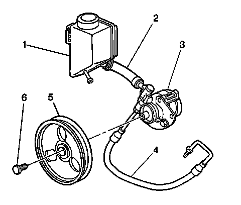 5. Remove the power steering fluid reservoir outlet hose (2) from the pump.