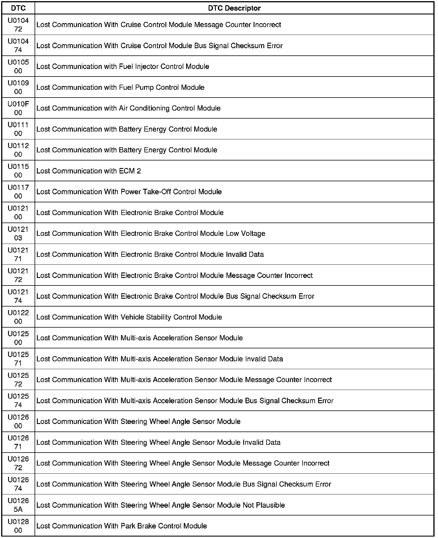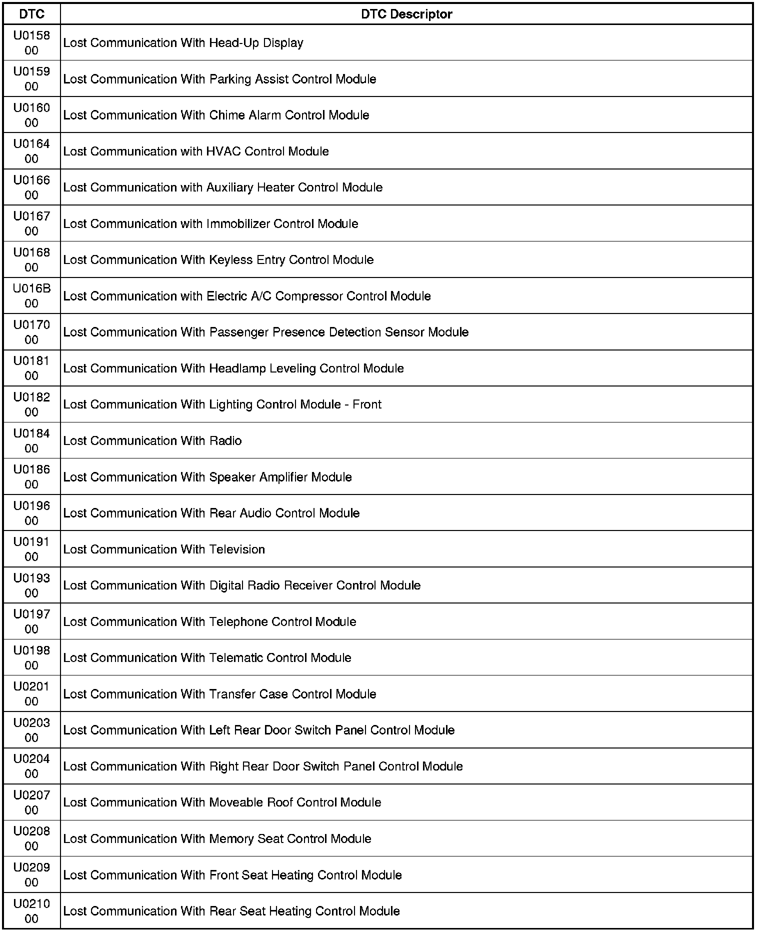 This list includes all Data Communications related U-code DTCs in alphanumeric order with descriptors for all modules. Not all DTCs listed will be applicable to all vehicles.