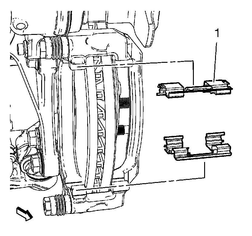 9. Remove the brake pad retainer springs (1) from the caliper bracket.